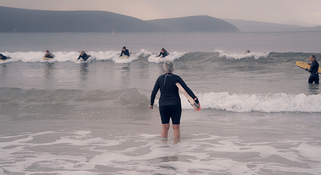 은발의 서퍼들이 호주의 한 해변에 모였다. |